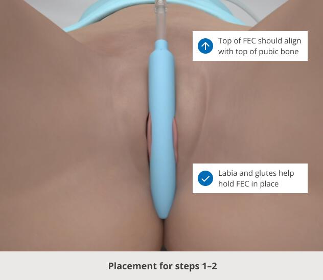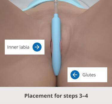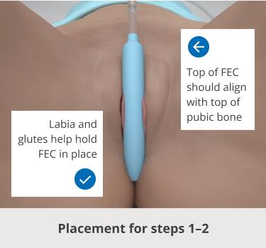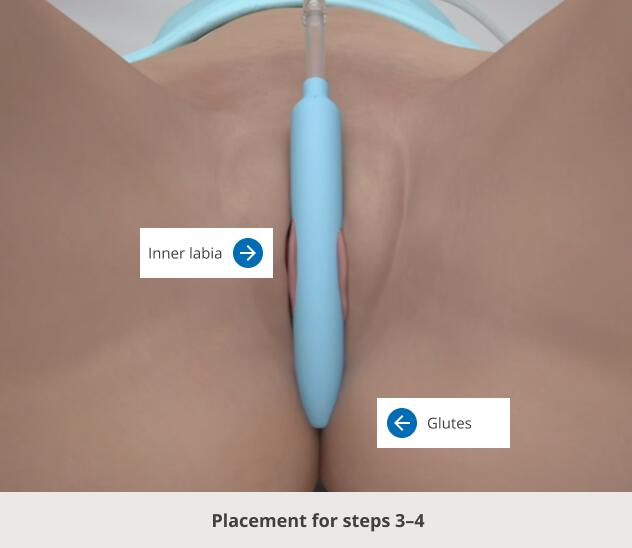 Next, separate the inner labia. Press the FEC snugly against the pubic bone and between the labia. Together, the labia and buttocks hold the FEC in place, so make sure it fits snugly between both.